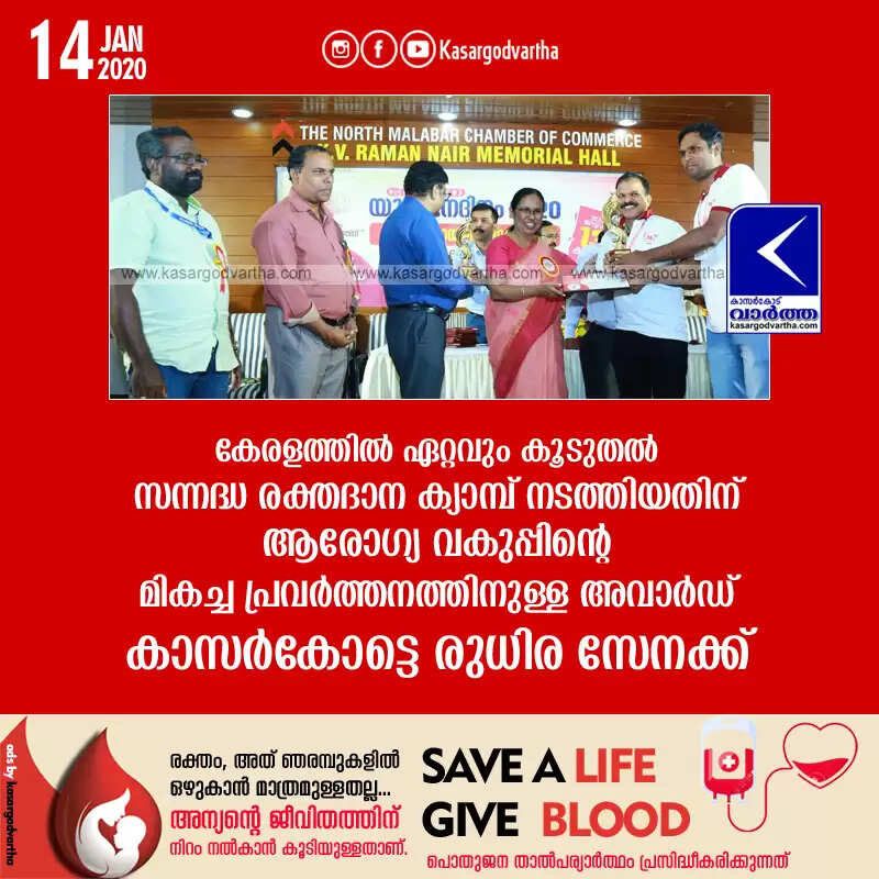 കേരളത്തില് ഏറ്റവും കൂടുതല് സന്നദ്ധ രക്തദാന ക്യാമ്പ് നടത്തിയതിന് ആരോഗ്യ വകുപ്പിന്റെ മികച്ച പ്രവര്ത്തനത്തിനുള്ള അവാര്ഡ് കാസര്കോട്ടെ രുധിര സേനക്ക്