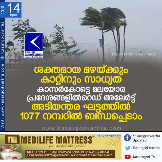 Keywords: Kasaragod, Kerala, News, Rain, Red Alert, Wind, Heavy Rain, Heavy rain and wind; Red alert in Kasaragod.