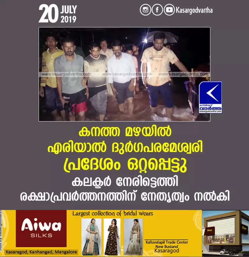 കനത്ത മഴയില് എരിയാല് ദുര്ഗപരമേശ്വരി പ്രദേശം ഒറ്റപ്പെട്ടു; കലക്ടര് നേരിട്ടെത്തി രക്ഷാപ്രവര്ത്തനത്തിന് നേതൃത്വം നല്കി