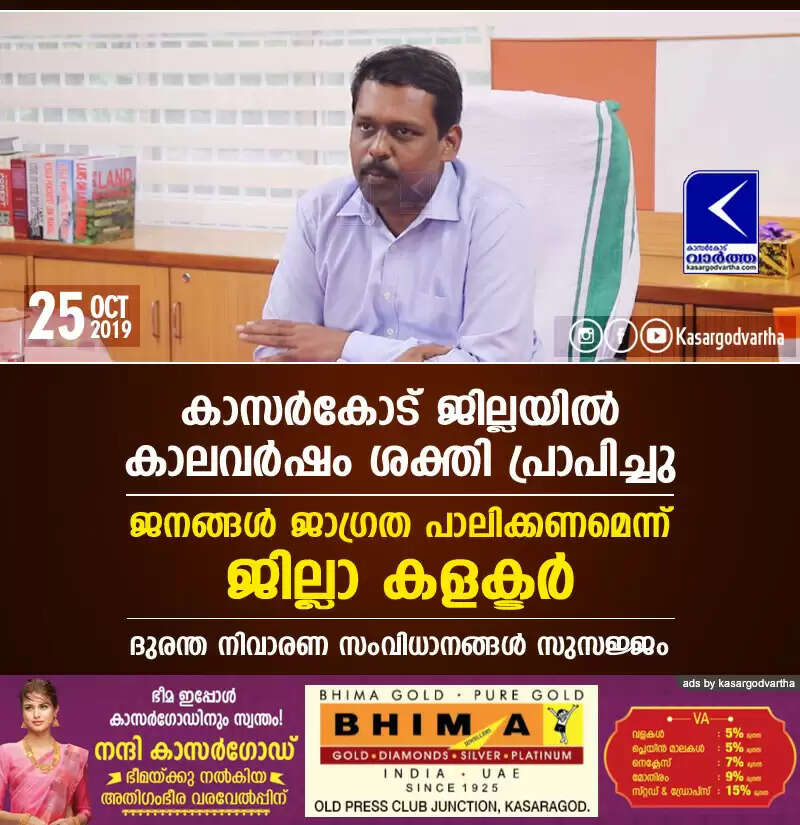 keywords: news, kasaragod, Kerala, Rain, Collectorate, District Collector, Police, fire force, Revenue-district, heavy rain in kasargod; alert announced by district collector