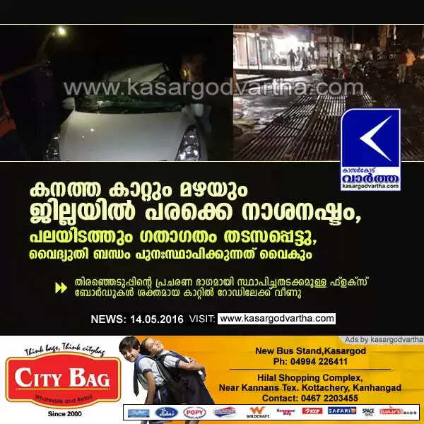 പഴയ ബസ് സ്റ്റാന്‍ഡില്‍ കെട്ടിടത്തിന് മുകളിലെ ഷീറ്റ് തകര്‍ന്നുവീണു. കൂറ്റന്‍ ഫ്‌ളക്‌സ് ബോര്‍ഡുകളും റോഡിലേക്ക് വീണു. ബോവിക്കാനത്തും, ബേവിഞ്ചയിലും ശക്തമായ കാറ്റും മഴയും നാശം വിതച്ചു. ഇവിടെ റോഡിലേക്ക് മരം പൊട്ടിവീണതിനാല്‍ ഗതാഗതം സ്തംഭിച്ചു. പലയിടത്തും വൈദ്യുതി മുടങ്ങി. ഇത് പുനഃസ്ഥാപിക്കാന്‍ രണ്ട് ദിവസം വേണ്ടിവരുമെന്നാണ് കെ എസ് ഇ ബി ഉദ്യോഗസ്ഥര്‍ പറയുന്നത്.