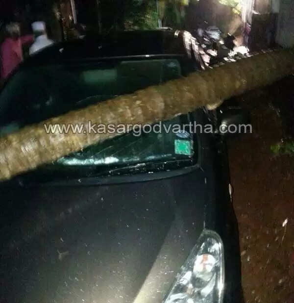 അണങ്കൂര്‍ ഹാര്‍ഡ് വെയര്‍ കട പാടേ തകര്‍ന്നു. വിദ്യാനഗറില്‍ സ്‌കൂളിന്റെ റൂഫിംഗ് ഷീറ്റ് കാറ്റത്ത് പാറി റോഡില്‍ പതിച്ചു. ചെര്‍ക്കള ബസ് സ്റ്റാന്‍ഡിന്റെ ഇരുമ്പ് ബോര്‍ഡും തകര്‍ന്നു വീണു. ഇവിടെ നിര്‍ത്തിയിട്ടിരുന്ന കെ എല്‍ 14 ആര്‍ 3300 നമ്പര്‍ കാറിന് മുകളിലേക്കാണ് ബോര്‍ഡ് വീണത്. ചെര്‍ക്കള - പൊവ്വല്‍ റോഡിലും മരങ്ങള്‍ കടപുഴകി വീണു. ഇവിടെ നിരവധി വാഹനങ്ങള്‍ ഗതാഗത കുരുക്കില്‍ പെട്ടു.