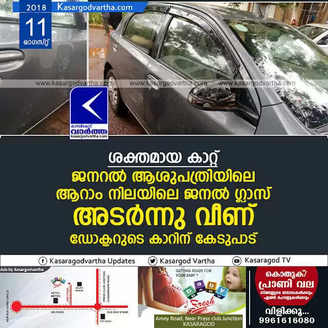 Keywords: Kasaragod, Kerala, news, Car, General-hospital, heavy Wind; Window Glass collapsed and Car destroyed