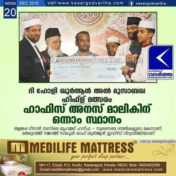 പയ്യന്നൂര്‍: (www.kasargodvartha.com 20/12/2016) കവ്വായിയില്‍ നടന്ന 'ദി ഹോളി ഖുര്‍ആന്‍ അല്‍ മുസാബഖ' അഖില കേരള ഹിഫ്‌ള് മത്സരത്തില്‍ ഹാഫിള് അനസ് മാലികിന് ഒന്നാം സ്ഥാനം. തെരുവത്ത് നജാത്ത് സ്‌കൂള്‍ ഓഫ് ഖുര്‍ആന്‍ സ്റ്റഡീസ് വിദ്യാര്‍ത്ഥിയാണ്. ഒരു ലക്ഷം രൂപ പ്രൈസ് മണിയും ഫലകവും സമ്മാനമായി ലഭിച്ചു.