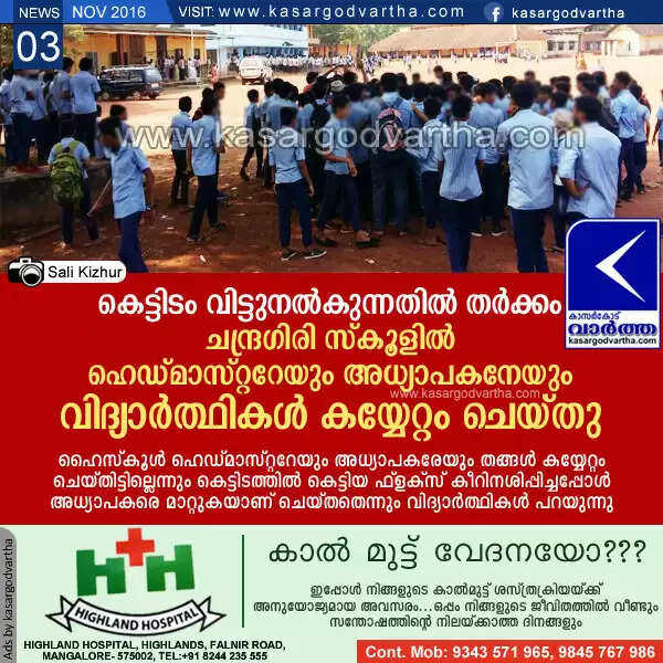 കെട്ടിടം വിട്ടുനല്കുന്നതില് തര്ക്കം; ചന്ദ്രഗിരി സ്കൂളില് ഹെഡ്മാസ്റ്ററേയും അധ്യാപകനേയും വിദ്യാര്ത്ഥികള് കയ്യേറ്റം ചെയ്തു