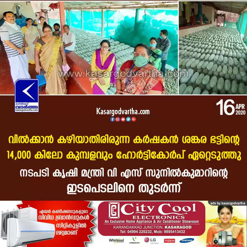 വില്ക്കാന് കഴിയാതിരിരുന്ന കര്ഷകന് ശങ്കര ഭട്ടിന്റെ 14,000 കിലോ കുമ്പളവും ഹോര്ട്ടികോര്പ് ഏറ്റെടുത്തു; നടപടി കൃഷി മന്ത്രി വി എസ് സുനില്കുമാറിന്റെ ഇടപെടലിനെ തുടര്ന്ന്
