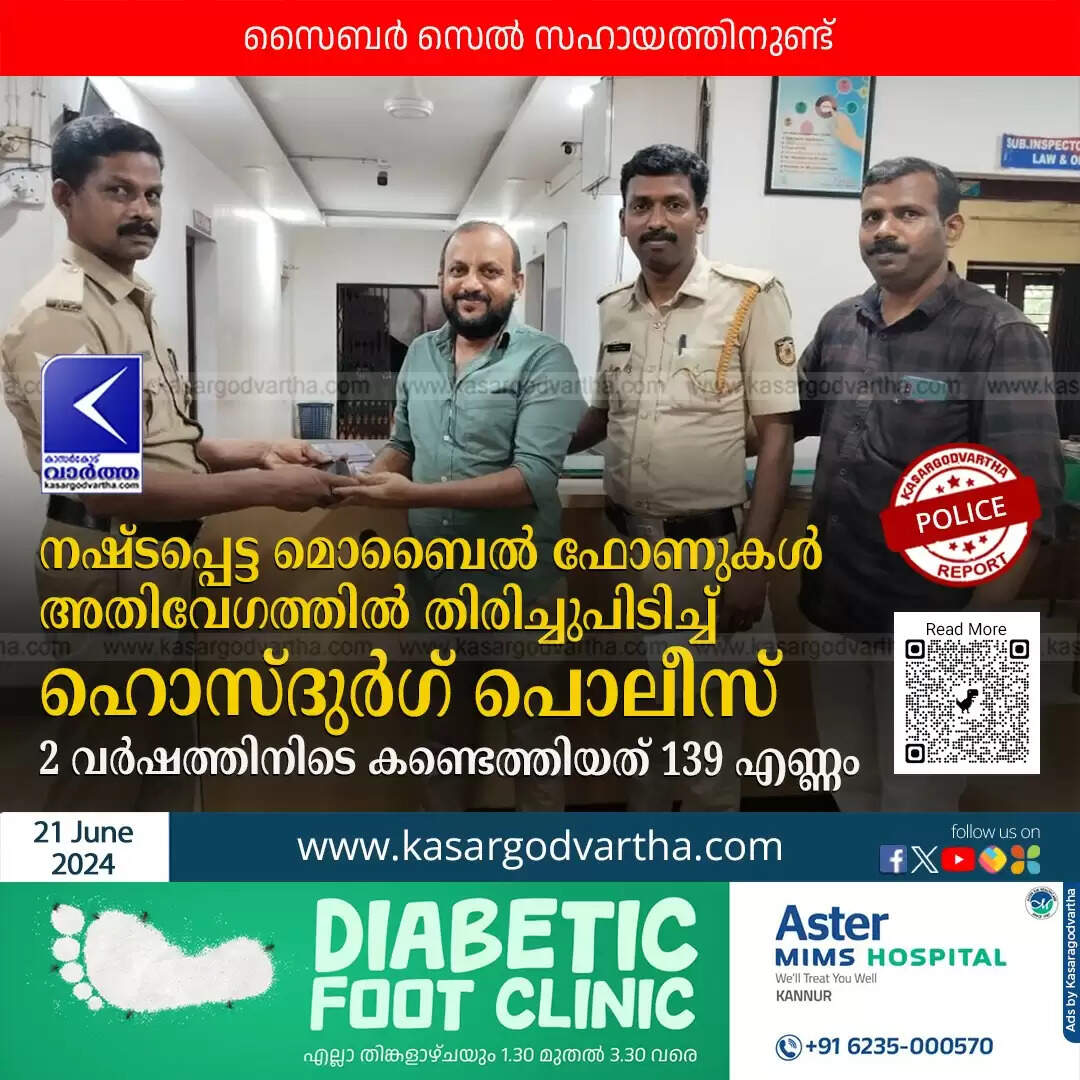 ചിത്താരിയിലെ സി കെ മുനീറിനാണ് കഴിഞ്ഞ ദിവസം ഹൊസ്ദുർഗ് പൊലീസ് 139-ാമത്തെ മൊബൈൽ ഫോൺ കണ്ടെത്തി നൽകിയത്. മുൻ ഹൊസ്ദുർഗ് എസ് എച് ഒ കെപി ഷൈൻ, ഇപ്പോഴത്തെ എസ് എച് ഒ എം പി ആസാദ് എന്നിവരുടെ നേതൃത്വത്തിൽ സൈബർ സെലിന്റ സഹായത്തോടെ സീനിയർ സിവിൽ പൊലീസ് ഓഫീസർ അനീഷ് ചെറുവത്തൂർ ആണ് ഫോൺ കണ്ടെത്തി നൽകിയത്. നഷ്ടപ്പട്ട ഫോൺ കണ്ടെത്തുന്നതിന് ജില്ല പൊലീസ് മേധാവി പി ബിജോയ്യും പ്രത്യേക പരിഗണന നൽകുന്നുണ്ട്.