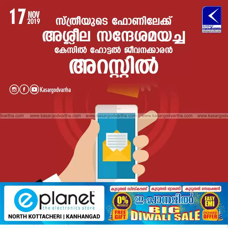 Keywords:  Kerala, news, kasaragod, Kanhangad, arrest, Hotel, employ, Police, Vellarikundu, Manjeshwaram, Hotel employee arrested for sending obscene messages