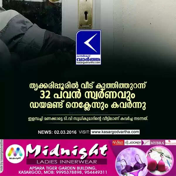 തൃക്കരിപ്പൂരില് വീട് കുത്തിത്തുറന്ന് 32 പവന് സ്വര്ണവും, ഡയമണ്ട് നെക്ലേസും കവര്ന്നു