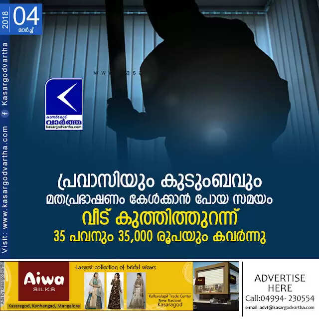 പ്രവാസിയും കുടുംബവും മതപ്രഭാഷണം കേള്ക്കാന് പോയ സമയം വീട് കുത്തിത്തുറന്ന് 35 പവനും 35,000 രൂപയും കവര്ന്നു
