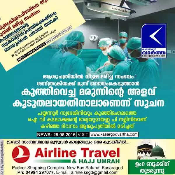 കാഞ്ഞങ്ങാട്:(www.kasargodvartha.com 25.05.2016) കാഞ്ഞങ്ങാട്ടെ സ്വകാര്യാശുപത്രിയില് ഗര്ഭപാത്രത്തിലെ മുഴ നീക്കം ചെയ്യുന്ന ശസ്ത്രക്രിയക്ക് വിധേയയായ യുവതി മരണപ്പെടാനുണ്ടായ കാരണം ശസ്ത്രക്രിയക്ക് മുമ്പ് ബോധംകെടുത്താന് കുത്തിവെച്ച മരുന്നിന്റെ അളവ് കൂടുതലായതിനാലാണെന്ന് സൂചന. പയ്യന്നൂര് സ്വദേശിനിയും കുഞ്ഞിമംഗലത്തെ ഐ വി കമലാക്ഷന്റെ ഭാര്യയുമായ ഇ പി നളിനിയാണ് കഴിഞ്ഞ ദിവസം ആശുപത്രിയില് മരിച്ചത്.