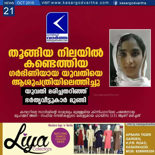 കാസര്‍കോട്: (www.kasargodvartha.com 21/10/2016) അഞ്ചു മാസം ഗര്‍ഭിണിയായ യുവതിയെ ഭര്‍തൃവീട്ടില്‍ തൂങ്ങിയ നിലയില്‍ കണ്ടെത്തി. യുവതിയെ ആശുപത്രിയിലെത്തിച്ചപ്പോഴേക്കും മരണം സംഭവിച്ചതിനാല്‍ മൃതദേഹം ആശുപത്രിയില്‍ കിടത്തി ഭര്‍തൃവീട്ടുകാര്‍ മുങ്ങി. തായ്‌ലാന്‍ഡില്‍ ജോലി ചെയ്യുന്ന കമ്പാറിലെ സാദിഖിന്റെ ഭാര്യ ഫായിസ (23) ആണ് മരിച്ചത്. വെള്ളിയാഴ്ച വൈകിട്ടാണ് സംഭവം.