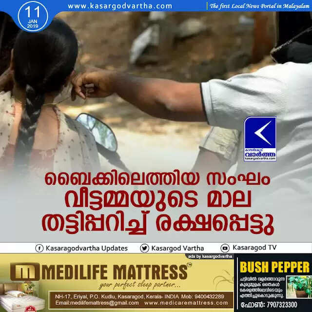 Keywords: House wife's chain snatched by bike riders, Gold chain, Robbery, Theft, Bike, Nileshwaram, News, Kasaragod.