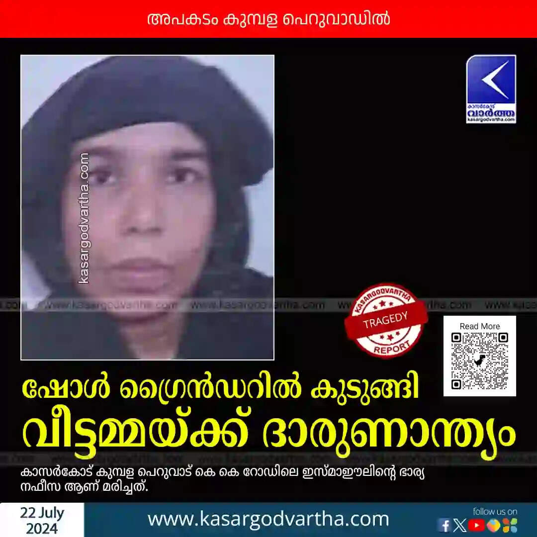 കുമ്പള: (KasargodVartha) കഴുത്തിലിട്ടിരുന്ന ഷോൾ പ്രവർത്തിച്ചുകൊണ്ടിരുന്ന ഗ്രൈൻഡറിൽ കുടുങ്ങി വീട്ടമ്മയ്ക്ക് ദാരുണാന്ത്യം. കുമ്പള പെറുവാട് കെ കെ റോഡിലെ ഇസ്മാഈലിന്റെ ഭാര്യയും അണങ്കൂർ സ്വദേശിനിയുമായ നഫീസ (53) ആണ് മരിച്ചത്. തിങ്കളാഴ്ച ഉച്ചയ്ക്ക് രണ്ട് മണിയോടെ വീട്ടിൽ ജോലി ചെയ്യുന്നതിനിടെയാണ് അപകടം സംഭവിച്ചത്.