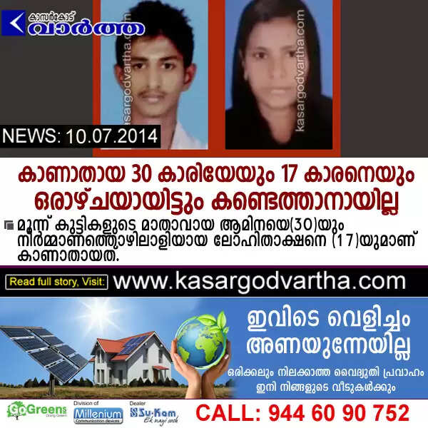 ഹൊസങ്കടി മജ്ബയലില് ഇലി ക്വാര്ട്ടേഴ്സില് താമസിക്കുന്ന ആമിനയെ(30)യും മജ്ബയല് സ്കൂളിന് സമീപം താമസിക്കുന്ന ലോഹിതാക്ഷനെ (17)യുമാണ് കാണാതായത്. ആമിനയെ കാണാതായതു സംബന്ധിച്ച് സഹോദരന് ഷാഫി നല്കിയ പരാതിയില് പോലീസ് കേസെടുത്ത് അന്വേഷണം നടത്തിയെങ്കിലും കണ്ടെത്താന് കഴിഞ്ഞില്ല.