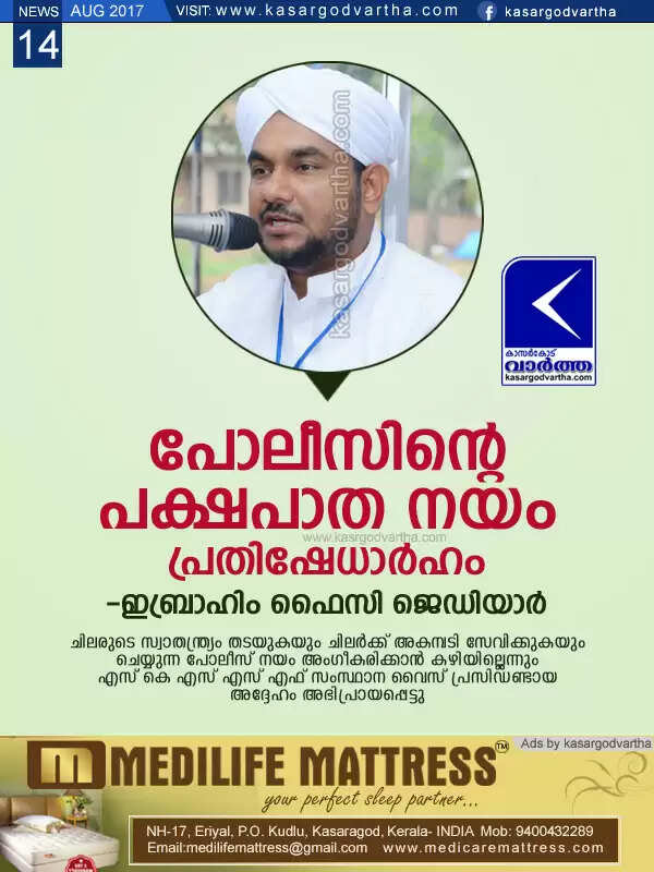 Keywords: Kasaragod, Kerala, news, SKSSF, Police, Ibrahim Faisi Jediyar against police