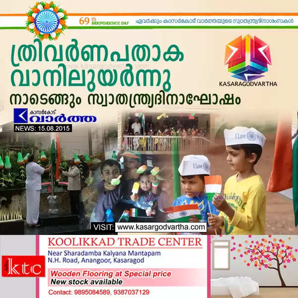 കാസര്കോട്: (www.kasargodvartha.com 15/08/2015) സ്വാതന്ത്ര്യ ദിനത്തന്റേയും സമരപോരാട്ടങ്ങളുടേയും ജ്വലിക്കുന്ന സ്മരണ നിലനിര്ത്തിക്കൊണ്ട് നാടും നഗരവും 69-ാം സ്വാതന്ത്ര്യദിനാഘോഷ ലഹരിയില്. ത്രിവര്ണപതാക വാനിലുയര്ന്നപ്പോള് ദേശഭക്തിഗാനവും ദേശീയഗാനവും ഉയര്ന്നു. സ്വാതന്ത്ര്യദിനാഘോഷങ്ങളുടെ ഭാഗമായി മധുര പലഹാര വിതരണവും പായസ ദാനവും ശുചീകരണ പ്രവര്ത്തനങ്ങളും പലയിടത്തും നടന്നു. സ്കൂളുകളില് രാവിലെ ദേശിയ പതാക ഉയര്ത്തി വിദ്യാര്ത്ഥികളും അധ്യാപകരും പ്രതിജ്ഞയെടുത്തു.