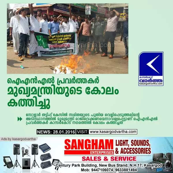 (www.kasargodvartha.com 28/01/2016) സോളാര്‍ തട്ടിപ്പില്‍ ഉള്‍പെട്ട മുഖ്യമന്ത്രി ഉമ്മന്‍ ചാണ്ടിയും സര്‍ക്കാരും രാജി വെക്കണമെന്ന് ആവശ്യപ്പെട്ട് ഐ എന്‍ എല്‍ കാസര്‍കോട് മണ്ഡലം കമ്മിറ്റി പ്രതിഷേധ പ്രകടനം നടത്തി ഉമ്മന്‍ ചാണ്ടിയുടെ കോലം കത്തിച്ചു. സോളാര്‍ തട്ടിപ്പ് കേസില്‍ സരിതയുടെ പുതിയ വെളിപ്പെടുത്തലിന്റെ അടിസ്ഥാനത്തില്‍ മുഖ്യമന്ത്രി രാജിവെക്കണമെന്നാവശ്യപ്പെട്ടായിരുന്നു പ്രതിഷേധം
