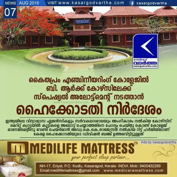 കൈതപ്രം എഞ്ചിനീയറിംഗ് കോളേജില് ബി. ആര്ക്ക് കോഴ്സിലേക്ക് സ്പെഷ്യല് അലോട്ട്മെന്റ് നടത്താന് ഹൈക്കോടതി നിര്ദേശം