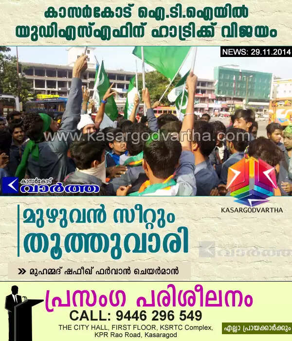 കാസര്കോട് ഐ.ടി.ഐയില് യു.ഡി.എസ്.എഫിന് ഹാട്രിക്ക് വിജയം; മുഴുവന് സീറ്റും തൂത്തുവാരി