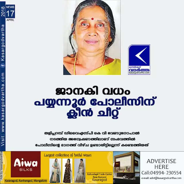 Keywords : Kasaragod, Kerala, Murder-case, Police, Payyannur, Janaki Murder Case, Police Clean Chit. Janaki Murder; Clean Chit For Payyanur Police