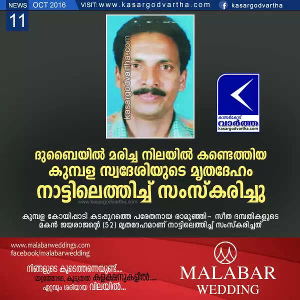 കുമ്പള: (www.kasargodvartha.com 11/10/2016) ദുബൈയില് ജോലി സ്ഥലത്ത് മരിച്ച നിലയില് കണ്ടെത്തിയ കുമ്പള സ്വദേശിയുടെ മൃതദേഹം നാട്ടിലെത്തിച്ച് സംസ്കരിച്ചു. കുമ്പള കോയിപ്പാടി കടപ്പുറത്തെ പരേതനായ രാമുഞ്ഞി- സീത ദമ്പതികളുടെ മകന് ജയരാജന്റെ (52) മൃതദേഹമാണ് ചൊവ്വാഴ്ച നാട്ടിലെത്തിച്ച് സംസ്കരിച്ചത്.