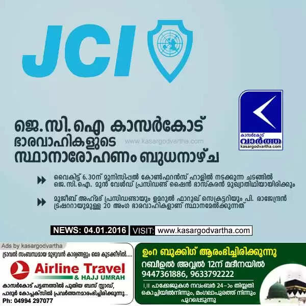 കാസര്കോട്: (www.kasargodvartha.com 04/01/2016) യുവജന സംഘടനയായ ജെ.സി.ഐ. കാസര്കോടിന്റെ ഭാരവാഹികളുടെ സ്ഥാനാരോഹണം ബുധനാഴ്ച വൈകിട്ട് 6.30ന് മുനിസിപ്പല് കോണ്ഫറന്സ് ഹാളില് നടക്കും. ജെ.സി.ഐ. മുന് വേള്ഡ് പ്രസിഡണ്ട് ഷൈന് ഭാസ്കരന് മുഖ്യാതിഥിയായിരിക്കും.