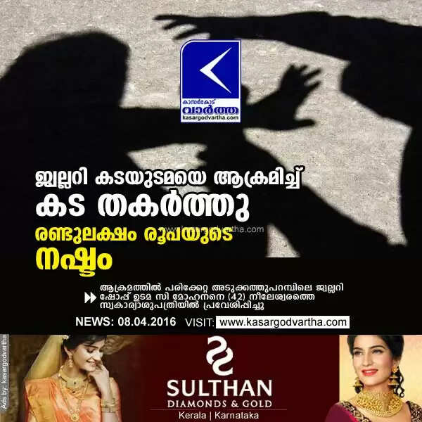 മടിക്കൈ: (www.kasargodavrtha.com 08.04.2016) ജ്വല്ലറി കടയുടമയെ ആക്രമിച്ച് കട തകര്‍ത്തു. ബുധനാഴ്ച രാത്രിയാണ് സംഭവം. രണ്ടുലക്ഷം രൂപയുടെ നഷ്ടം കണക്കാക്കുന്നു. ആക്രമത്തില്‍ പരിക്കേറ്റ അടുക്കത്തുപറമ്പിലെ ജ്വല്ലറി ഷോപ്പ് ഉടമ സി മോഹനനെ (42) നീലേശ്വരത്തെ സ്വകാര്യാശുപത്രിയില്‍ പ്രവേശിപ്പിച്ചു.