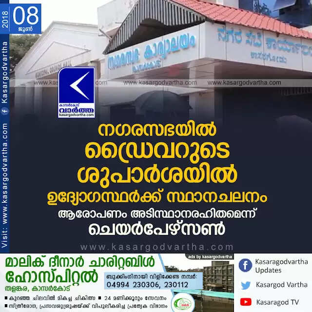നഗരസഭയില് ഡ്രൈവറുടെ ശുപാര്ശയില് ഉദ്യോഗസ്ഥര്ക്ക് സ്ഥാനചലനം; ആരോപണം അടിസ്ഥാനരഹിതമെന്ന് ചെയര്പേഴ്സണ്