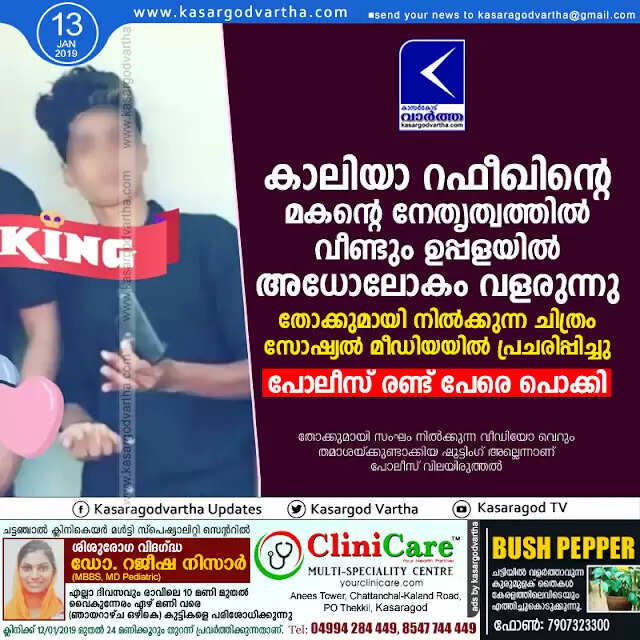 കാലിയാ റഫീഖിന്റെ മകന്റെ നേതൃത്വത്തില് വീണ്ടും ഉപ്പളയില് അധോലോകം വളരുന്നു; തോക്കുമായി നില്ക്കുന്ന ചിത്രം സോഷ്യല് മീഡിയയില് പ്രചരിപ്പിച്ചു; പോലീസ് രണ്ട് പേരെ പൊക്കി