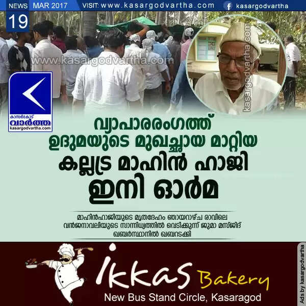 മാങ്ങാട്: (www.kasargodvartha.com 19.03.2017) വ്യാപാരരംഗത്ത് ഉദുമയുടെ മുഖഛായ മാറ്റിയ മാങ്ങാട് വെടിക്കുന്നിലെ കല്ലട്ര മാഹിന്‍ഹാജി(90) ഇനി ഓര്‍മ. മാഹിന്‍ഹാജിയുടെ മൃതദേഹം ഞായറാഴ്ച രാവിലെ വന്‍ജനാവലിയുടെ സാന്നിധ്യത്തില്‍ വെടിക്കുന്ന് ജുമാ മസ്ജിദ് ഖബര്‍ സ്ഥാനില്‍ ഖബറടക്കി. രാഷ്ട്രീയ - സാമുദായിക - സാംസ്‌കാരിക - മേഖലകളിലെ പ്രമുഖര്‍ അടക്കം നിരവധി പേര്‍ നാടിന്റെ നാനാഭാഗങ്ങളില്‍ നിന്നായി കല്ലട്ര മാഹിന്‍ ഹാജിക്ക് അന്ത്യോപചാരമര്‍പ്പിക്കാനെത്തിയിരുന്നു.
