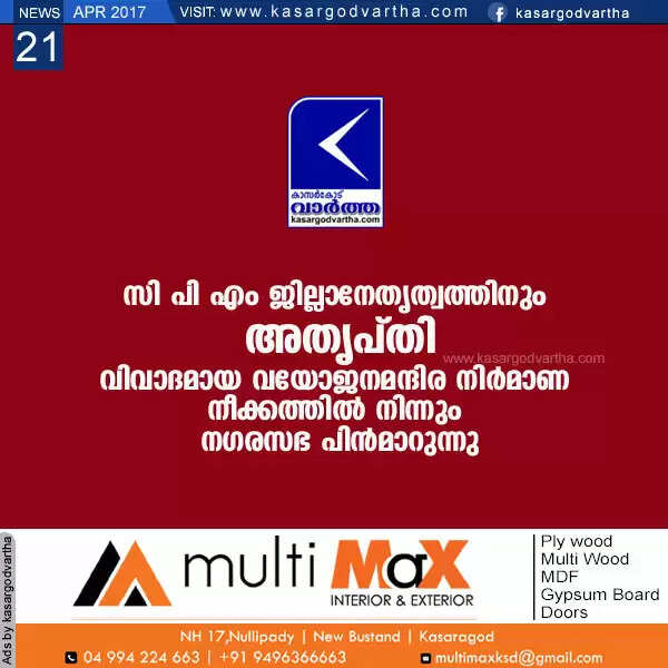 സി പി എം ജില്ലാനേതൃത്വത്തിനും അതൃപ്തി; വിവാദമായ വയോജനമന്ദിര നിര്മാണ നീക്കത്തില് നിന്നും നഗരസഭ പിന്മാറുന്നു
