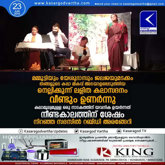 കാസര്‍കോട്:(www.kasargodvartha.com 23/06/2019) ഒരു കാലത്ത് കാസര്‍കോട്ടെ പ്രധാന കലാവേദിയായിരുന്ന നെല്ലിക്കുന്ന് റോഡിലെ ലളിതകലാസദനത്തിന് പുതുജീവന്‍. നീണ്ട കാലത്തിന് ശേഷം ലളിതകലാസദനത്തില്‍ കലാമൂല്യമുള്ള ഒരു നാടകത്തിന് യവനിക ഉയര്‍ന്നപ്പോള്‍ നാടകം ആസ്വദിക്കാനെത്തിയത് നിറഞ്ഞ സദസ്. അമ്പത് വര്‍ഷങ്ങള്‍ക്ക് മുമ്പ് സ്ഥാപിതമായ ലളിതകലാ സദനത്തില്‍ ആടാനും പാടാനും മികച്ച അഭിനയ മുഹൂര്‍ത്തങ്ങള്‍ സൃഷ്ടിക്കാനും എത്താത്ത കലാകാരന്മാര്‍ അപൂര്‍വ്വമായിരുന്നു.