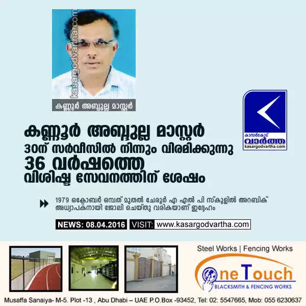 കണ്ണൂര് അബ്ദുല്ല മാസ്റ്റര് 30ന് സര്വീസില് നിന്നും വിരമിക്കുന്നു; 36 വര്ഷത്തെ വിശിഷ്ട സേവനത്തിന് ശേഷം