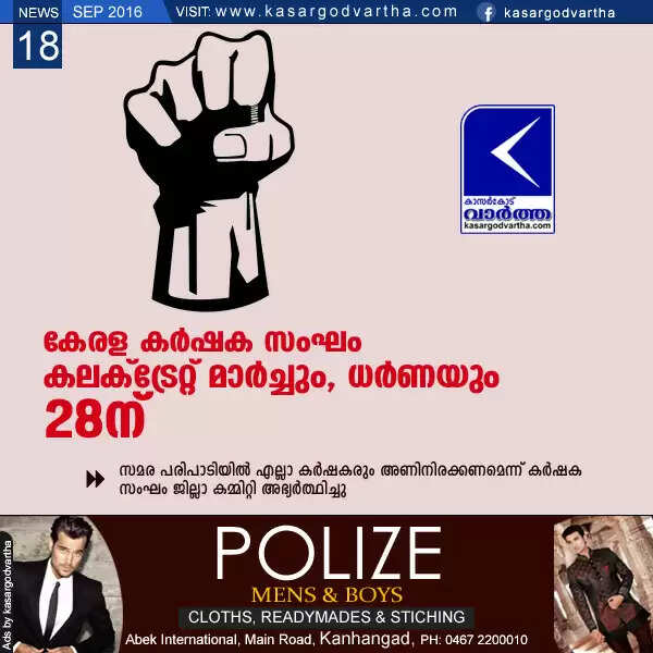 കേരള കര്ഷക സംഘം കലക്ട്രേറ്റ് മാര്ച്ചും, ധര്ണയും 28ന്