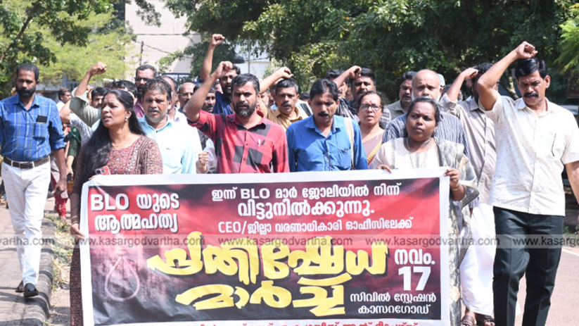 ബിഎൽഒയുടെ മരണം: കാസർകോട്ട് ജില്ലാ തെരഞ്ഞെടുപ്പ് ഓഫീസിലേക്ക് അധ്യാപകരും ജീവനക്കാരും പ്രതിഷേധ മാർച്ച് നടത്തി