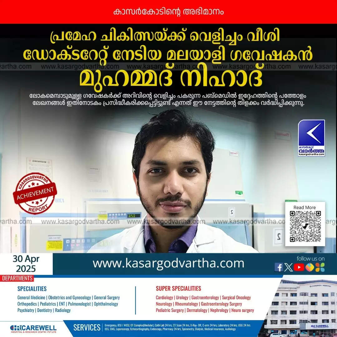 കാസർകോടിൻ്റെ അഭിമാനം! പ്രമേഹ ചികിത്സയ്ക്ക് വെളിച്ചം വീശി ഡോക്ടറേറ്റ് നേടിയ മലയാളി ഗവേഷകൻ മുഹമ്മദ് നിഹാദ്