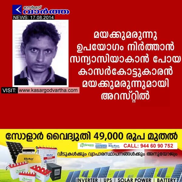 മയക്കുമരുന്നു ഉപയോഗം നിര്‍ത്താന്‍ സന്യാസിയാകാന്‍ പോയ കാസര്‍കോട്ടുകാരന്‍ മയക്കുമരുന്നുമായി അറസ്റ്റില്‍
