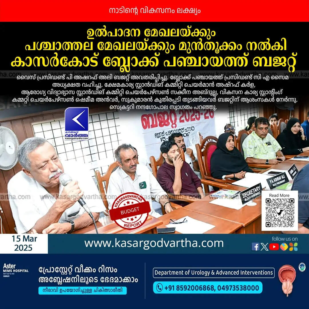 Kasargod Block Panchayat's 2025-26 budget focuses on production, infrastructure, and social welfare, prioritizing agriculture, women empowerment, housing, and health sectors.