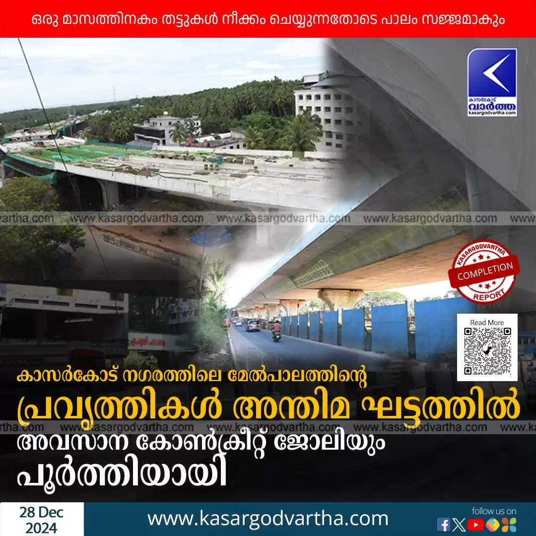 Completion | കാസർകോട് നഗരത്തിലെ മേൽപാലത്തിന്റെ പ്രവൃത്തികൾ അന്തിമ ഘട്ടത്തിൽ; അവസാന കോൺക്രീറ്റ് ജോലിയും പൂർത്തിയായി