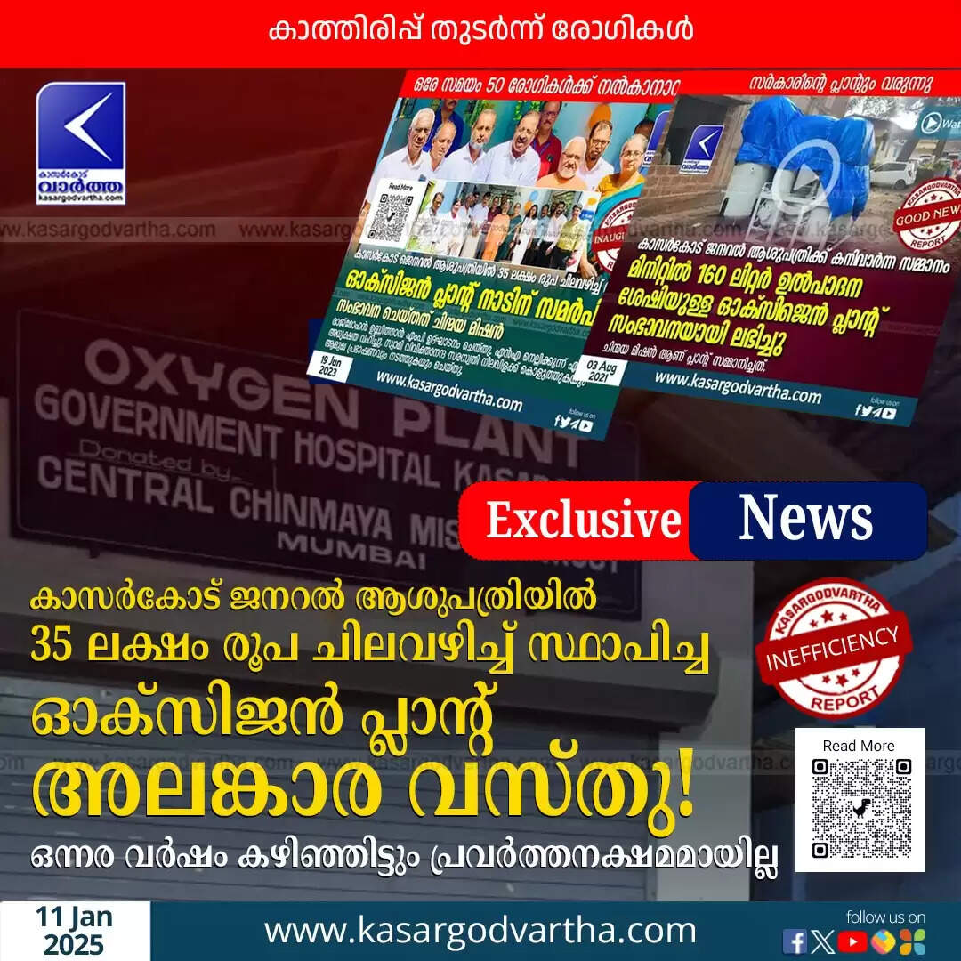 കോവിഡ് രണ്ടാം തരംഗത്തിന്റെ തുടക്ക കാലത്ത് ജില്ലയിലെ ആശുപത്രികൾ ഓക്സിജൻ ക്ഷാമം രൂക്ഷമായി നേരിട്ടിരുന്നു. അയൽ സംസ്ഥാനങ്ങളെയും ജില്ലകളെയുമാണ് ഓക്സിജനായി ആശ്രയിക്കേണ്ടി വന്നത്. ഈ സമയത്താണ് സ്വന്തമായി കാസർകോട്ട് തന്നെ ഓക്സിജൻ പ്ലാന്റ് വേണമെന്ന ബോധ്യം അധികൃതരിൽ ഉണ്ടായത്. ഇതിനിടയിലാണ് ചിന്മയ മിഷനും സഹായവുമായി മുന്നോട്ട് വന്നത്. ജനറൽ ആശുപത്രിയിൽ സ്വന്തമായി ഓക്സിജൻ പ്ലാന്റ് ഉണ്ടാകുന്നത് വലിയ ആശ്വാസമാകുമെന്ന് പ്രതീക്ഷിച്ചിരുന്നു. എന്നാൽ, പുതിയ പ്ലാന്റിന്റെ ഇപ്പോഴത്തെ അവസ്ഥ ഈ പ്രതീക്ഷകളെല്ലാം തകിടം മറിച്ചിരിക്കുകയാണ്.