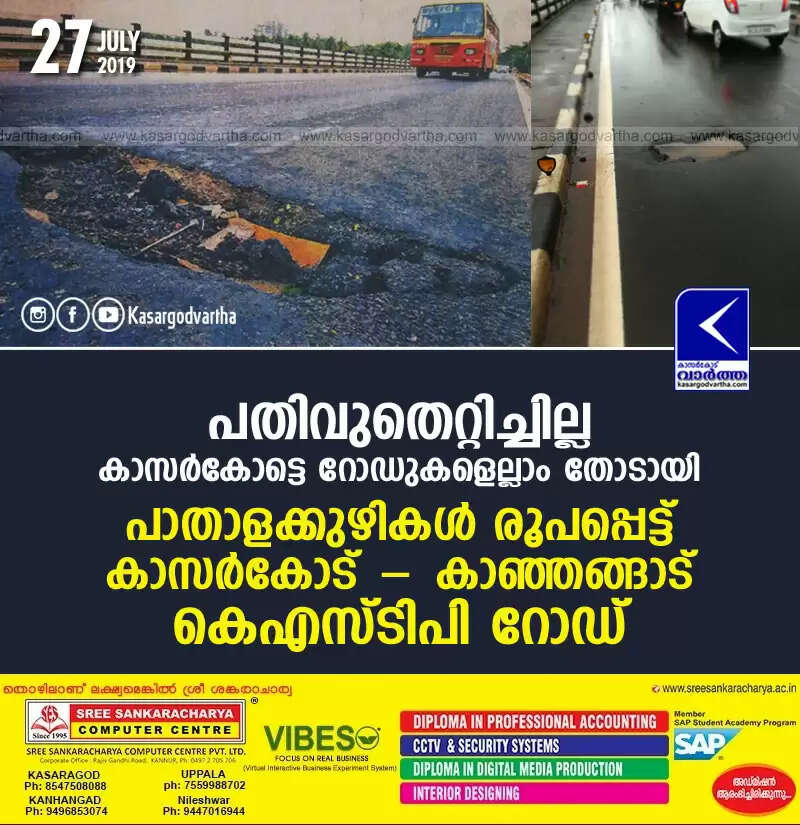 പതിവുതെറ്റിച്ചില്ല; കാസര്കോട്ടെ റോഡുകളെല്ലാം തോടായി; പാതാളക്കുഴികള് രൂപപ്പെട്ട് കാസര്കോട് - കാഞ്ഞങ്ങാട് കെഎസ്ടിപി റോഡ്