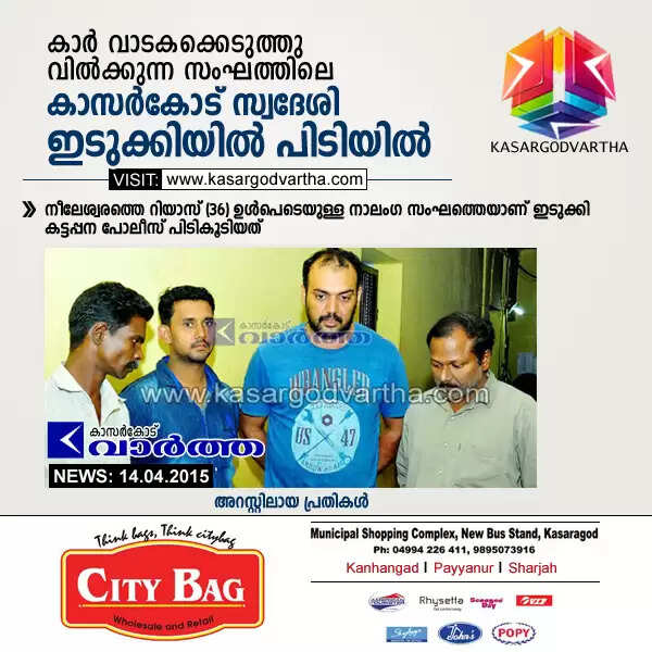 തൊടുപുഴ: (www.kasargodvartha.com 14/04/2015) കാര് വാടകയ്ക്കെടുത്ത് മറിച്ചുവില്ക്കുന്ന സംഘത്തില് പെട്ട കാസര്കോട് സ്വദേശി ഇടുക്കിയില് പിടിയിലായി. നീലേശ്വരത്തെ റിയാസ് (36) ആണ് ഇടുക്കി കട്ടപ്പന പോലീസിന്റെ പിടിയിലായത്. ഇയാളുടെ കൂട്ടുപ്രതികളായ കൊല്ലം തങ്കശേരി സ്റ്റാന്വില്ല ഹെറാള്ഡ് (41), മലപ്പുറം നിലമ്പൂര് ചേലക്കോടന് ഹമീദ് (34), നിലമ്പൂര് ചന്തമുക്ക് കളത്തറ ബാബുക്കുട്ടന് (41) എന്നിവരെയും പോലീസ് അറസ്റ്റ് ചെയ്തു.