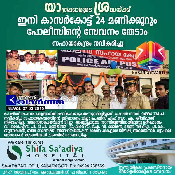 നവീകരിച്ച സഹായകേന്ദ്രത്തിന്റെ ഉദ്ഘാടനം ജില്ലാ പോലീസ് ചീഫ് ഡോ. എ. ശ്രീനിവാസ് നിര്‍വഹിച്ചു. നഗരസഭാചെയര്‍മാന്‍ ടി.ഇ. അബ്ദുല്ലയുടെ സാന്നിധ്യത്തിലായിരുന്നു ഉദ്ഘാടനം. ഡി.വൈ.എസ്.പി. ടി.പി. രഞ്ജിത്ത്, ട്രാഫിക്ക് സി.ഐ. വി. രമേശന്‍, ടൗണ്‍ സി.ഐ. പി.കെ. സുധാകരന്‍, ബസ് ഓണേഴ്‌സ് അസോസിയേഷന്‍ ഭാരവാഹികളായ ഗിരീഷ്, അസൈനാര്‍, വ്യാപാരി നേതാക്കള്‍ തുടങ്ങിയവര്‍ ചടങ്ങില്‍ സംബന്ധിച്ചു.