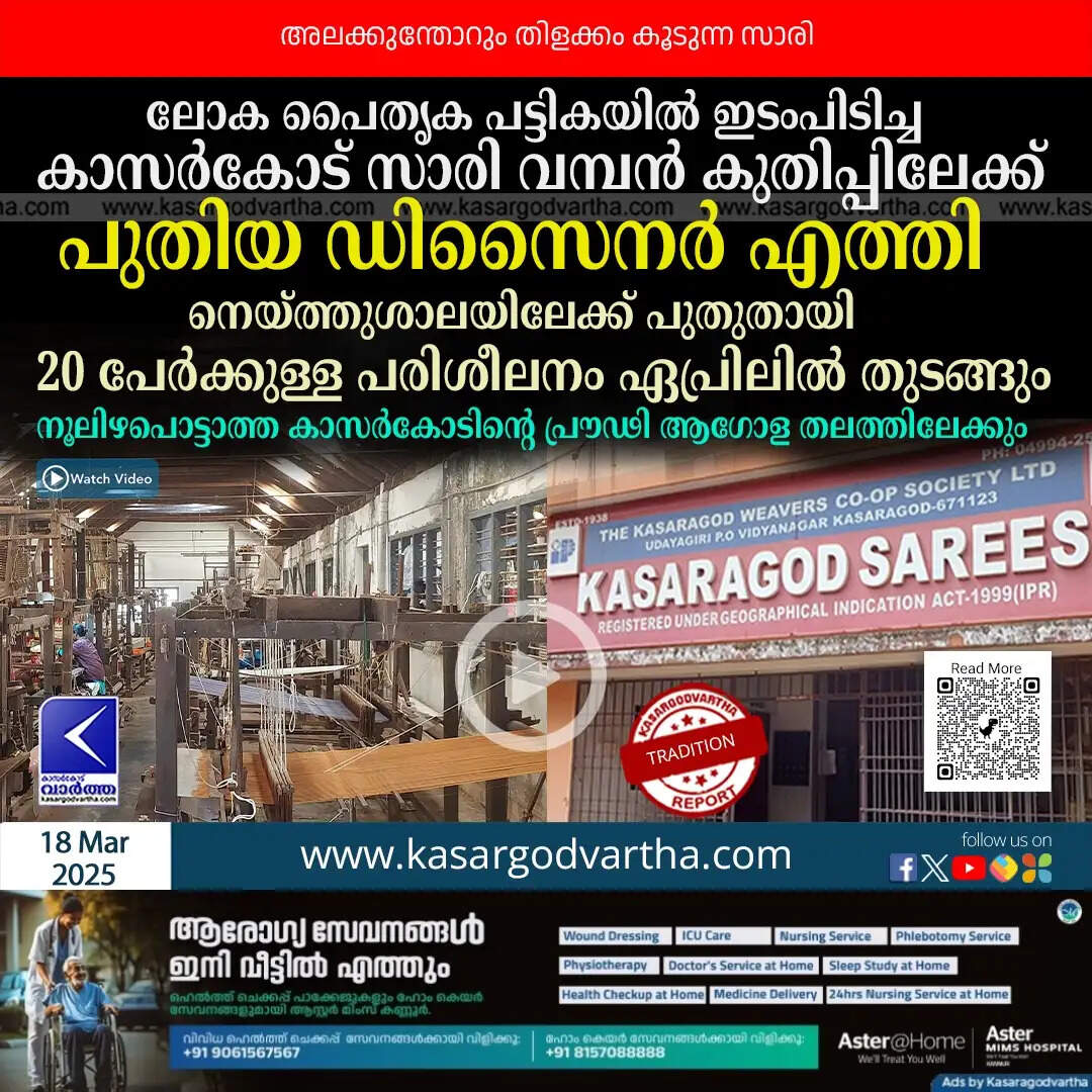 Tradition | ലോക പൈതൃക പട്ടികയിൽ ഇടംപിടിച്ച കാസർകോട് സാരി വമ്പൻ കുതിപ്പിലേക്ക്; പുതിയ ഡിസൈനർ എത്തി; നെയ്ത്തുശാലയിലേക്ക് പുതുതായി 20 പേർക്കുള്ള പരിശീലനം ഏപ്രിലിൽ തുടങ്ങും
