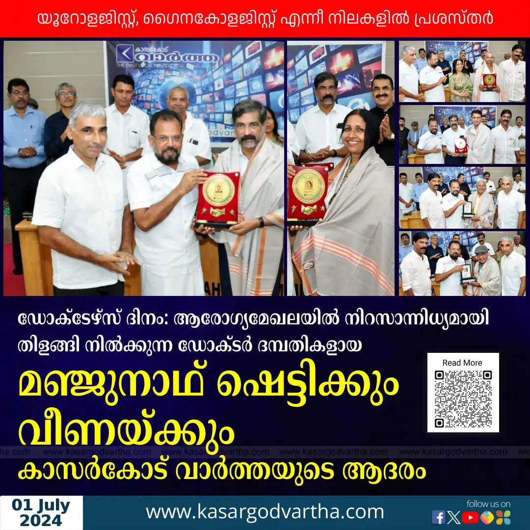 Honors | ഡോക്ടേഴ്സ് ദിനം: ആരോഗ്യമേഖലയിൽ നിറസാന്നിധ്യമായി തിളങ്ങി നിൽക്കുന്ന ഡോക്ടർ ദമ്പതികളായ മഞ്ജുനാഥ് ഷെട്ടിക്കും വീണയ്ക്കും കാസർകോട് വാർത്തയുടെ ആദരം