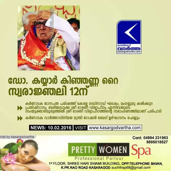 ബദിയഡുക്ക: (www.kasargodvartha.com 10/02/2016) കര്ണാടക ജാനപത പരിഷത്ത് കേരള ഗഡിനാഡ് ഘടകം, മംഗളൂരു കല്ക്കൂറ പ്രതിഷ്ഠാനം, ബദിയഡുക്ക ശ്രീ ഭാരതീ വിദ്യാപീഠം എന്നിവയുടെ സംയുക്താഭിമുഖ്യത്തില് 12ന് ശ്രീ ഭാരതീ വിദ്യാപീഠത്തിന്റെ സഭാംഗണത്തില് ഗഡിനാഡ പ്രതിഭ ശതായുഷി ഡോ. കയ്യാര് കിഞ്ഞണ്ണ റൈയുടെ സ്മരാണാര്ത്ഥം സ്വരാജ്ഞലി പരിപാടി സംഘടിപ്പിക്കും. കര്ണാടക വാര്ത്താവിനിമയ മന്ത്രി റോഷന് ബേഗ്, പരിപാടി ഉദ്ഘാടനം ചെയ്യും.