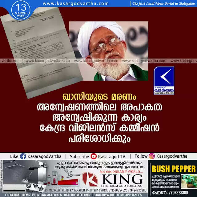 ഖാസിയുടെ മരണം; അന്വേഷണത്തിലെ അപാകത അന്വേഷിക്കുന്ന കാര്യം കേന്ദ്ര വിജിലന്സ് കമ്മീഷന് പരിശോധിക്കും