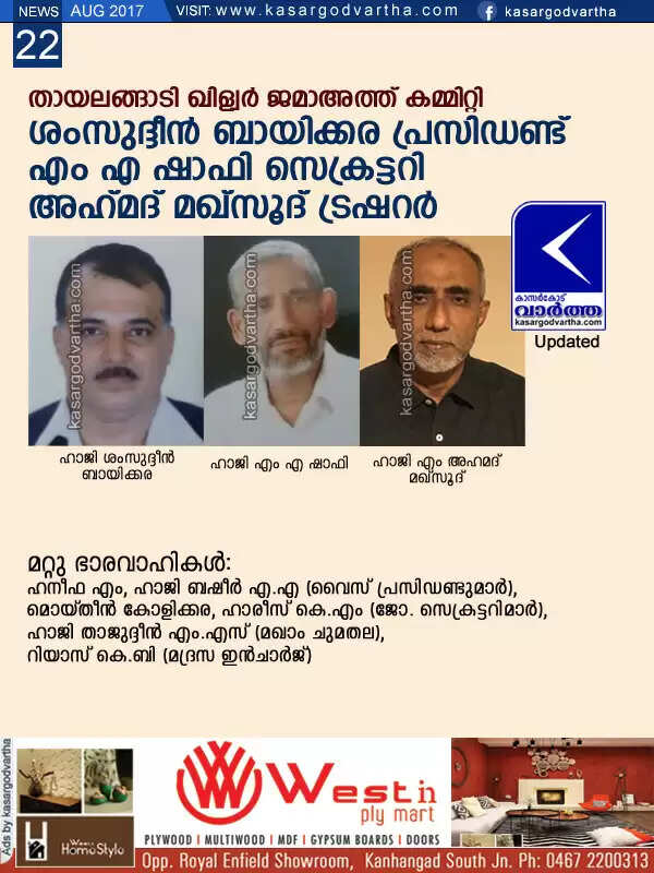 തായലങ്ങാടി ഖിള്വര് ജമാഅത്ത് കമ്മിറ്റി; ശംസുദ്ദീന് ബായിക്കര പ്രസിഡണ്ട്, എം എ ഷാഫി സെക്രട്ടറി, അഹ് മദ് മഖ്സൂദ് ട്രഷറര്