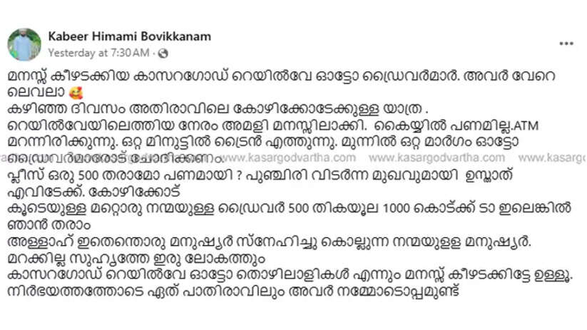 കബീർ ഹിമമി 500 രൂപയാണ് ആവശ്യപ്പെട്ടത്. എന്നാൽ 1000 രൂപ നൽകി സഹായിക്കുകയായിരുന്നു ഓടോറിക്ഷ ഡ്രൈവർമാർ. 'ഇതെന്തൊരു മനുഷ്യർ. സ്നേഹിച്ചു കൊല്ലുന്ന നന്മയുളള മനുഷ്യർ. മറക്കില്ല സുഹൃത്തേ ഇരു ലോകത്തും. കാസർകോട് റെയിൽവേ ഓട്ടോ തൊഴിലാളികൾ എന്നും മനസ്സ് കീഴടക്കിട്ടേ ഉള്ളൂ. നിർഭയത്തത്തോടെ ഏത് പാതിരാവിലും അവർ നമ്മോടൊപ്പമുണ്ട്', അദ്ദേഹം കുറിച്ചു.